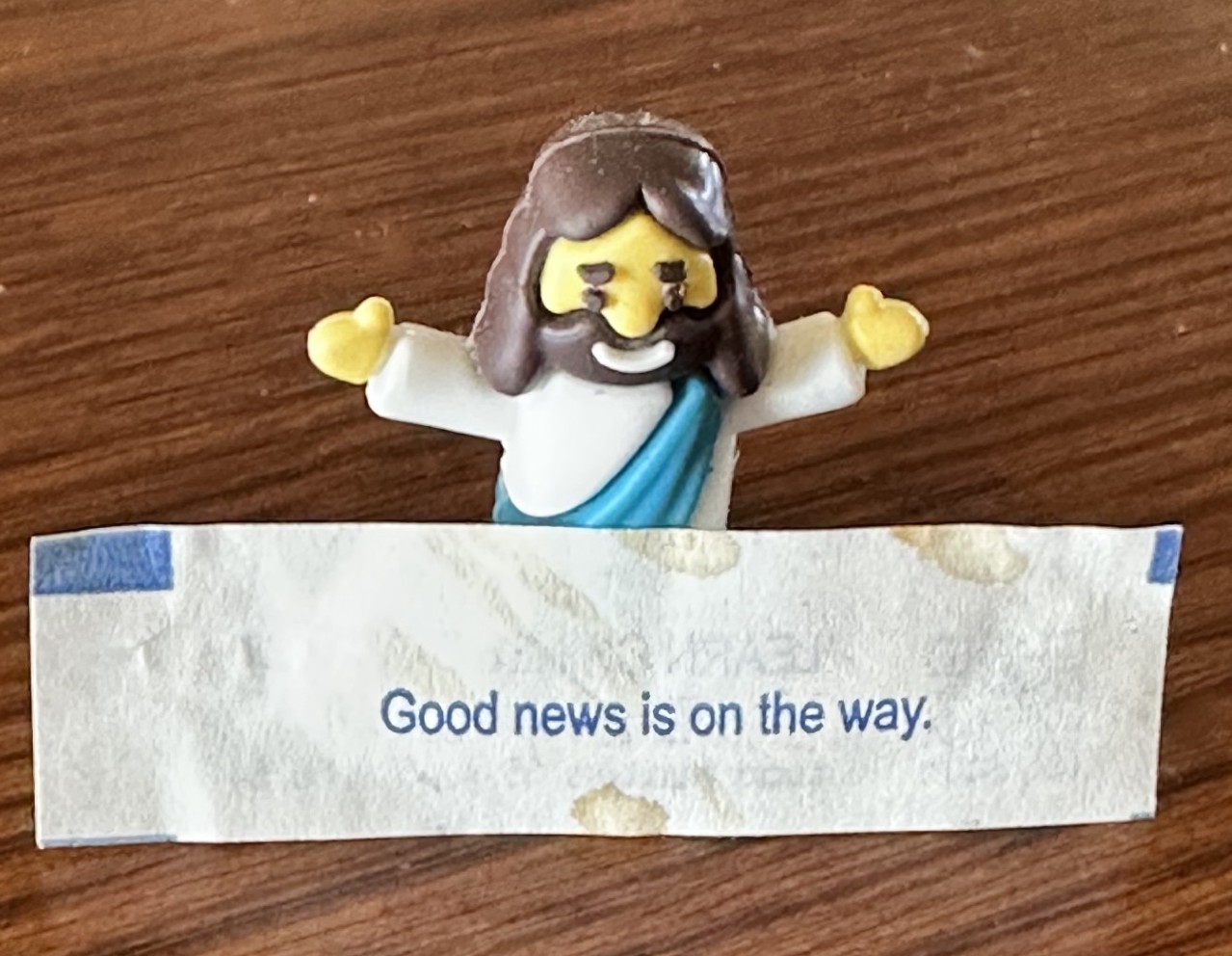 Then this week, I found a fortune cookie slip while cleaning my car. It said: “Good news is on the way.” Naturally, my first thought was: Well, I hope this means I’m winning the lottery soon… or that Iowa State is going to win the national championship in basketball. But as I went to throw the slip away, I noticed my tiny little rubber Jesus sitting on our shoe shelf. I leaned that fortune up against the small statue of Jesus and thought: Oh. It’s about Jesus.